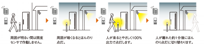 エコルトトランスの照度センサ機能にエコルトポールライトの温度感知(人感)センサ機能を組み合わせて利用すれば、暗くなるとほんのり点灯 。