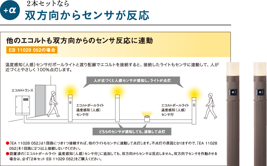 さらに、エコルトポールライトに渡り配線すれば、接続された他のライトにも温度感知(人感)センサが働きます。