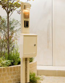 優しい色合いの空間の中で、門柱のモザイクタイルがアクセントに。