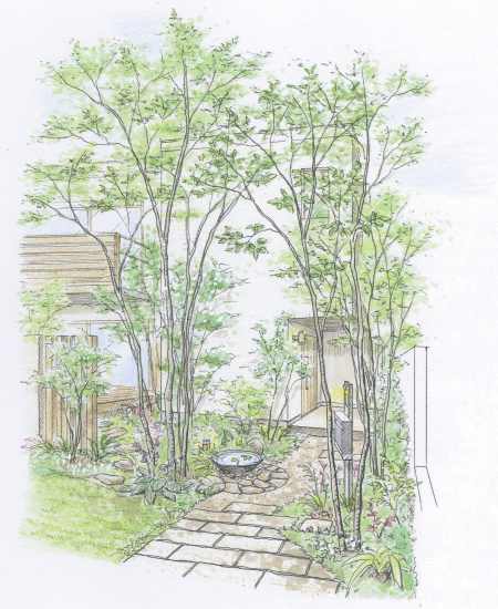 夏場の強い日差しによる不快感をなくすために、樹高の高い落葉樹を配置。