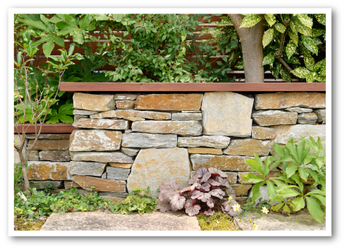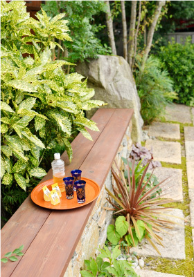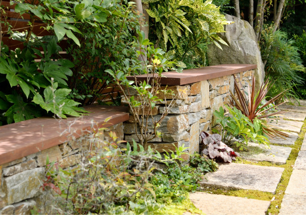 植栽の中に調和する石積みのベンチには、