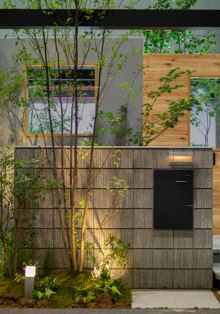 高さのある門塀は、圧迫感を抑えるために建物側に寄せ、塀の前後、建物際にも雑木を植栽することで、柔らかな印象をつくり出しています。