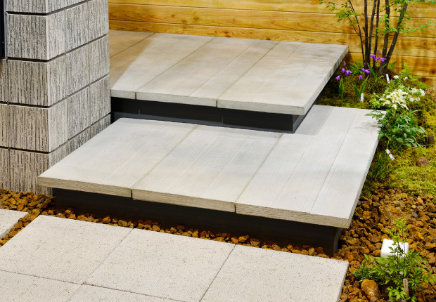 「表情のある木の外壁に対して、繊細な表情を持つグレー色のブロック塀や舗装でモダンな印象をつくり、