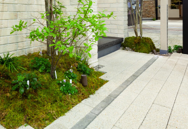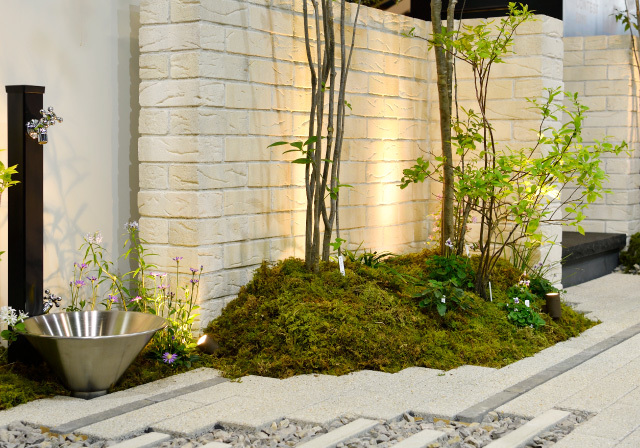 狭小地でも、植栽がバランスよく配置されたゆとりのある空間が実現。巧みなアイテム使いが光るプランです。