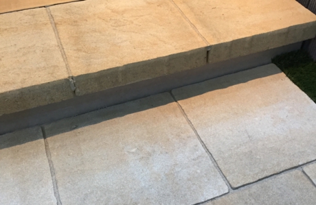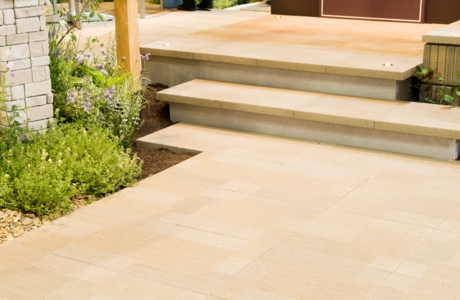 アプローチに使用したコンクリート舗装材『ベガスシーム』はパッチワーク風の意匠が特徴。「カタログで見た印象より使いやすそう!」「独特の意匠がさりげないアクセントになっていて良かった。」と評価をいただきました。