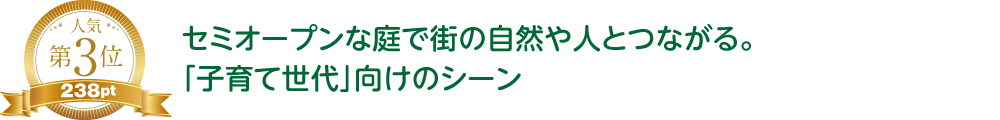 室内からテラスまでをつないだアウトドアリビングのプラン。小さな子どもが素足で遊ぶ姿が目に浮かびます。「控え壁をレンガ花壇と一体化するアイデアがいい」「モザイクタイルの使い方が素敵」など、実際のプランの参考にしたいというご意見を多くいただきました。