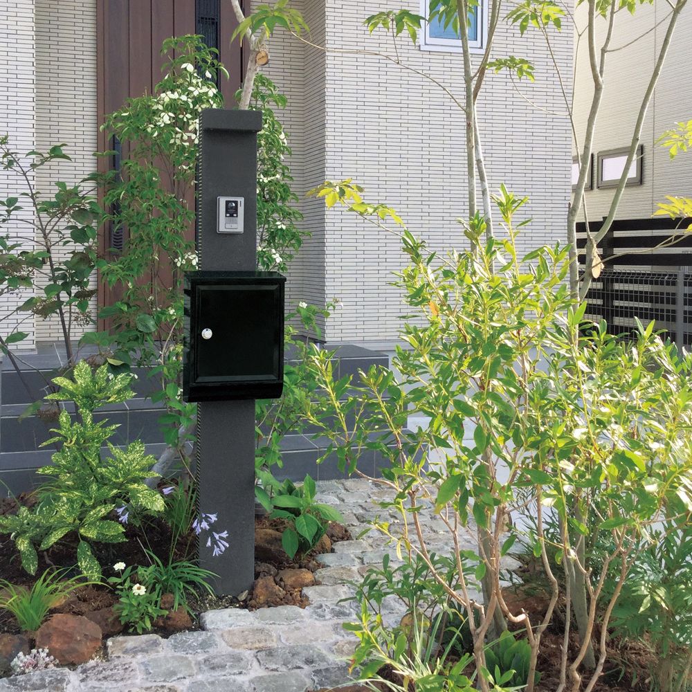 植栽と組み合わせ空間に馴染んでいる様子やサインやポストがコーディネートされている作品。 |